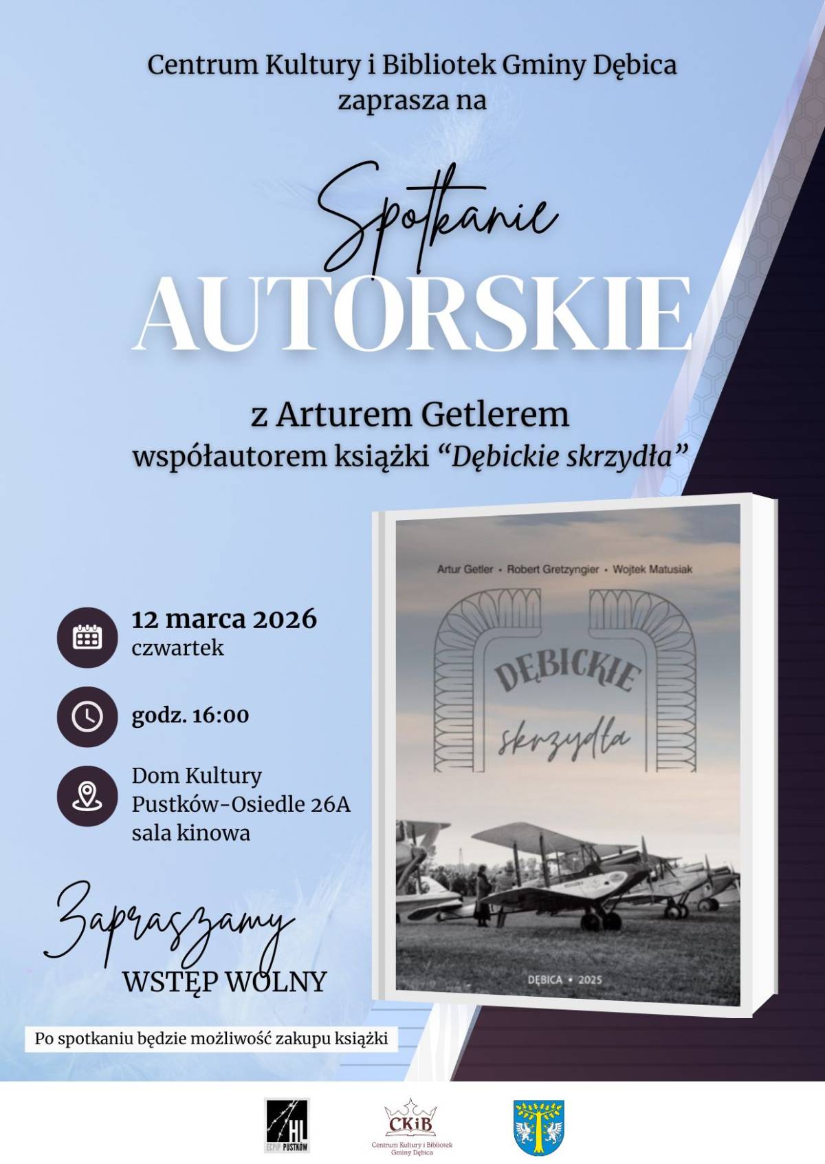 Centrum Kultury i Bibliotek Gminy Dębica zaprasza na spotkanie autorskie z Arturem Getlerem, współautorem książki „Dębickie skrzydła”. Wydarzenie odbędzie się 12 marca 2026 roku (czwartek) o godz. 16:00 w Domu Kultury w Pustkowie-Osiedlu (sala kinowa), ul. Pustków-Osiedle 26A.